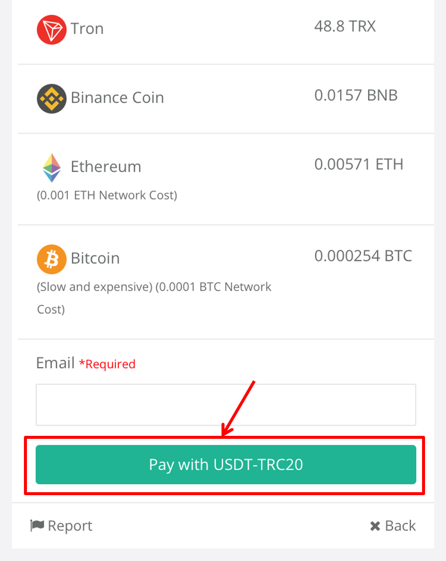 USDT、USDC、Litecoin、TRON、Binance Coin、BTC、Ethereumなど多くの選択肢が表示されますのでご自身が準備した通貨を選んでください。