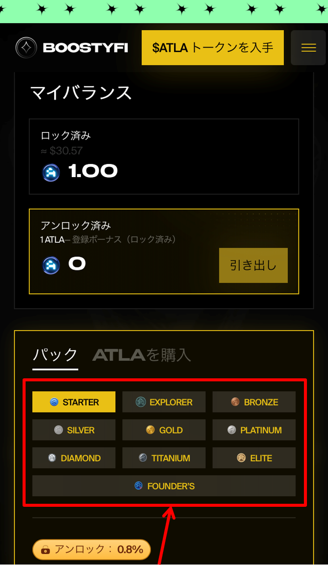 Boostyfiのあなたのアカウントに戻り、ダッシュボードに購入したATLA coinの数量が反映されているかを確認しましょう。(反映には数分かかる場合があります)