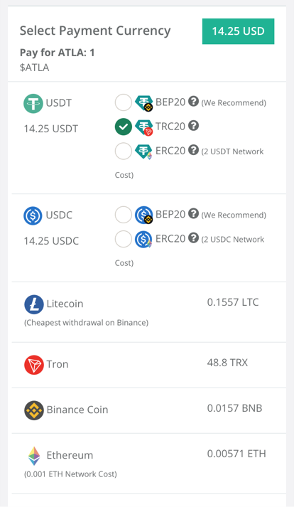 ATLA coinの購入には様々な暗号資産で支払いが可能です。